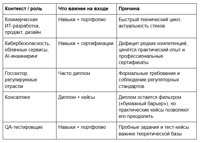 Наличие образования само по себе не гарантирует успешного найма, особенно в ИТ, маркетинге, дизайне и других практических сферах.